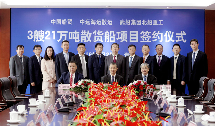 中遠(yuǎn)海運散貨運輸有限公司副總經(jīng)理黃志強、中國船舶重工國際貿(mào)易有限公司副總經(jīng)理蔡洙一和武船集團北船重工黨委書記、董事長王國海代表三方在建造合同上簽字。